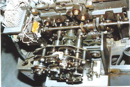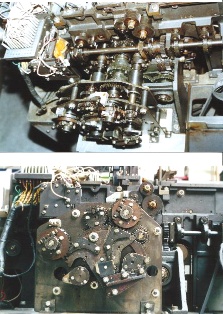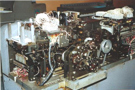 ![]() La reporteuse, capot ouvert. On distingue ici, à gauche, la piste d'alimentation des cartes compte. Au fond, à